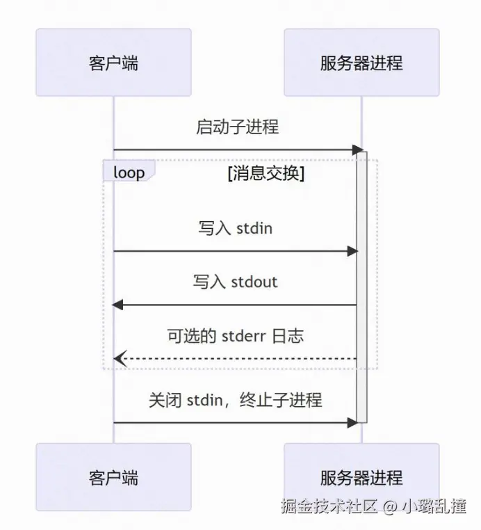 在 Stdio 中,MCP 客户端将 MCP 服务器作为一个子进程来启动,服务端通过标准输入(stdin)接收消息,并通过标准输出(stdout)响应消息。除此之外,服务端可以通过标准错误(stderr)来记录日志。