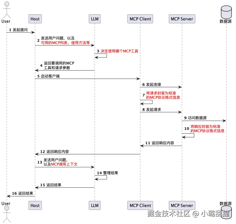 由上图可以看出,执行的动作其实还是由 Host 完成的,并不是由 LLM 完成。MCP 定义的 Host 和上文提到的中介程序,本质是相同的,都完成各个事情的编排。其次,MCP 这个协议只是规定了 MCP Client 与 MCP Server 之间的交互,但与 LLM 的交互无关,与 LLM 交互时,其实只是传递了相应的 prompt,而并不会要求 LLM 以 MCP 协议格式来传递信息。