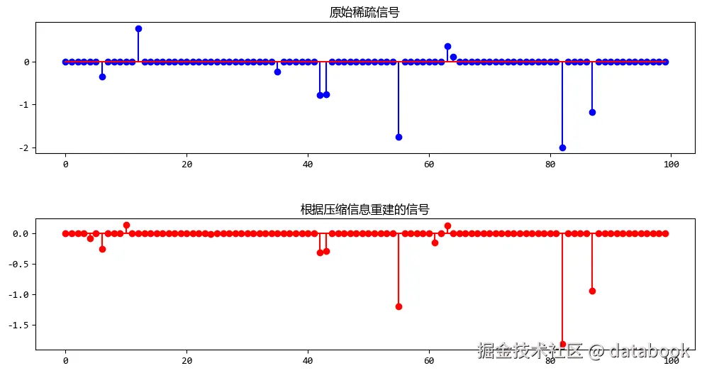 - 生成稀疏信号:我们创建了一个长度为 100 的信号,其中只有 10 个非零元素。这些非零元素是随机生成的,并且打乱了顺序。