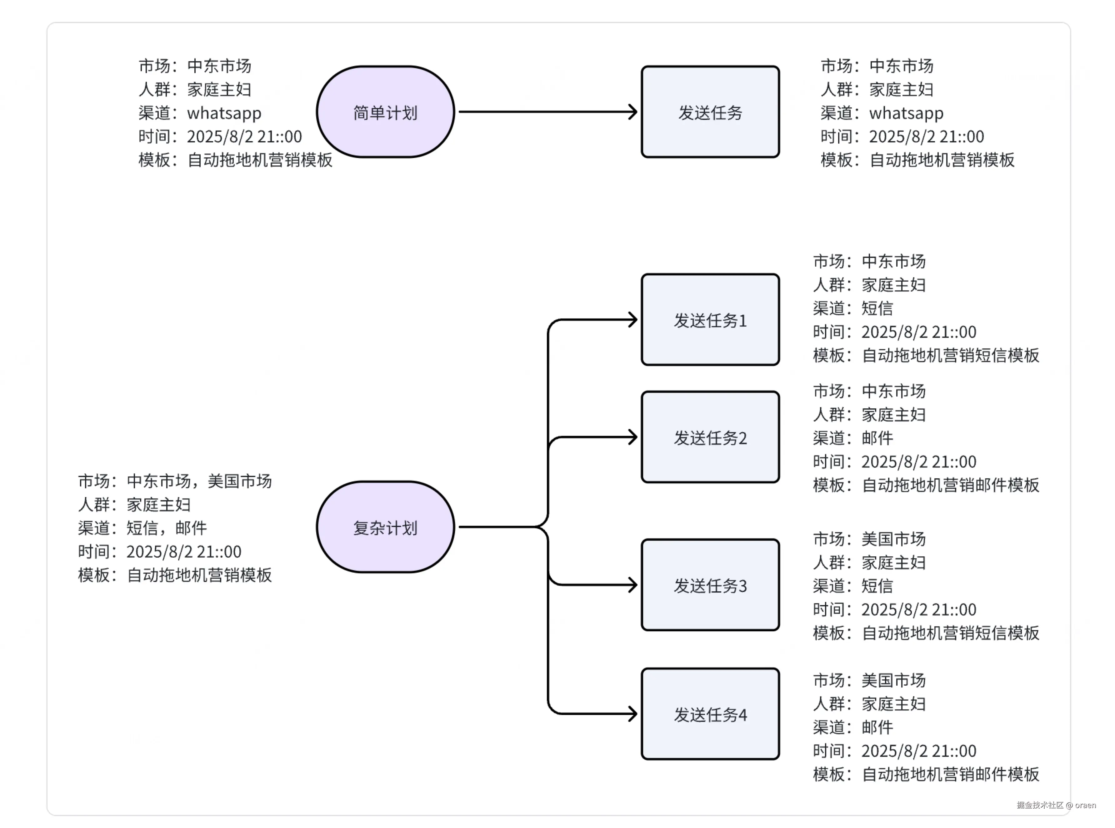 计划就是根据规则创建的单次发送计划,就是什么时候通过哪些渠道给哪些用户发送消息。计划也是业务视角上的一个概念,这个相对与技术视角上的任务,任务指的也是一次发送消息给用户的任务,也包括了具体的时间,发送的渠道,模板,以及目标人群,不同的地方就是,一个计划可以涵盖多个渠道,多个市场,而任务需要区分技术链路和数据源只能指定一个渠道或者市场,也就是说通常情况下一个简单的计划都会对应一个任务,但是也会有一些复杂的计划,比如对于同时发送给多个运营市场的计划,如果多个运营市场的用户是隔离的。或者这个计划需要通过多个渠道给用户发送营销消息。那么就可能需要创建多个任务来完成这个计划。下图是一个计划是任务的对应关系图