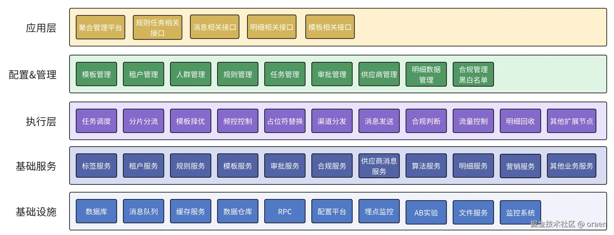 聚合管理平台就是我们整个营销消息触达平台的门面了,我们平台几乎所有的操作,包括任务看板,人群标签管理,租户管理,发送/频控规则管理,消息模板管理,成本控制,供应商管理,合规管理,明细数据查看,审批流程,服务监控大盘等等,都在这里。不过它本身并不会存储实际业务数据,基本都是从各领域服务获取到数据或者转发到各领域服务提供的功能接口实现操作的。从难度上来说他可能说是比较小的,但在工作量上它确完全不小,因为需要做的事情太多了,而且如果想要保证业务的使用体验,还需要付出更多心血,不过一般来说我们也并不是一开始就把所有功能接入了,而且先做核心部分,根据慢慢地完善其他功能。