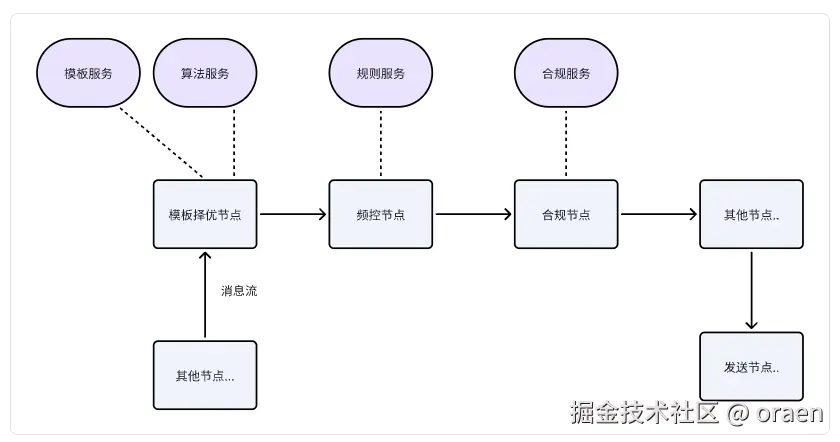 前面说的都是节点自己无法控制的情况下的处理情况,由于依赖服务都是由于节点调用来完成功能的,所以依赖服务出现异常时候我们节点是可以处理的,这时候就需要依赖于我们节点对服务调用异常的代码处理了,我们可以在发送调用异常后做一些降级处理,比如模板择优的节点因为算法服务异常拿不到最优模板,那么我们就只能发送模板组的第一个模板或者转化率最高的模板(如果能获取),对于频控规则服务获取不到频控规则时就可以选择暂时去掉频控逻辑,直接发给下游,对于实在无法降级的情况,也只能考虑把这条消息暂时塞入特殊队列等待服务恢复了。