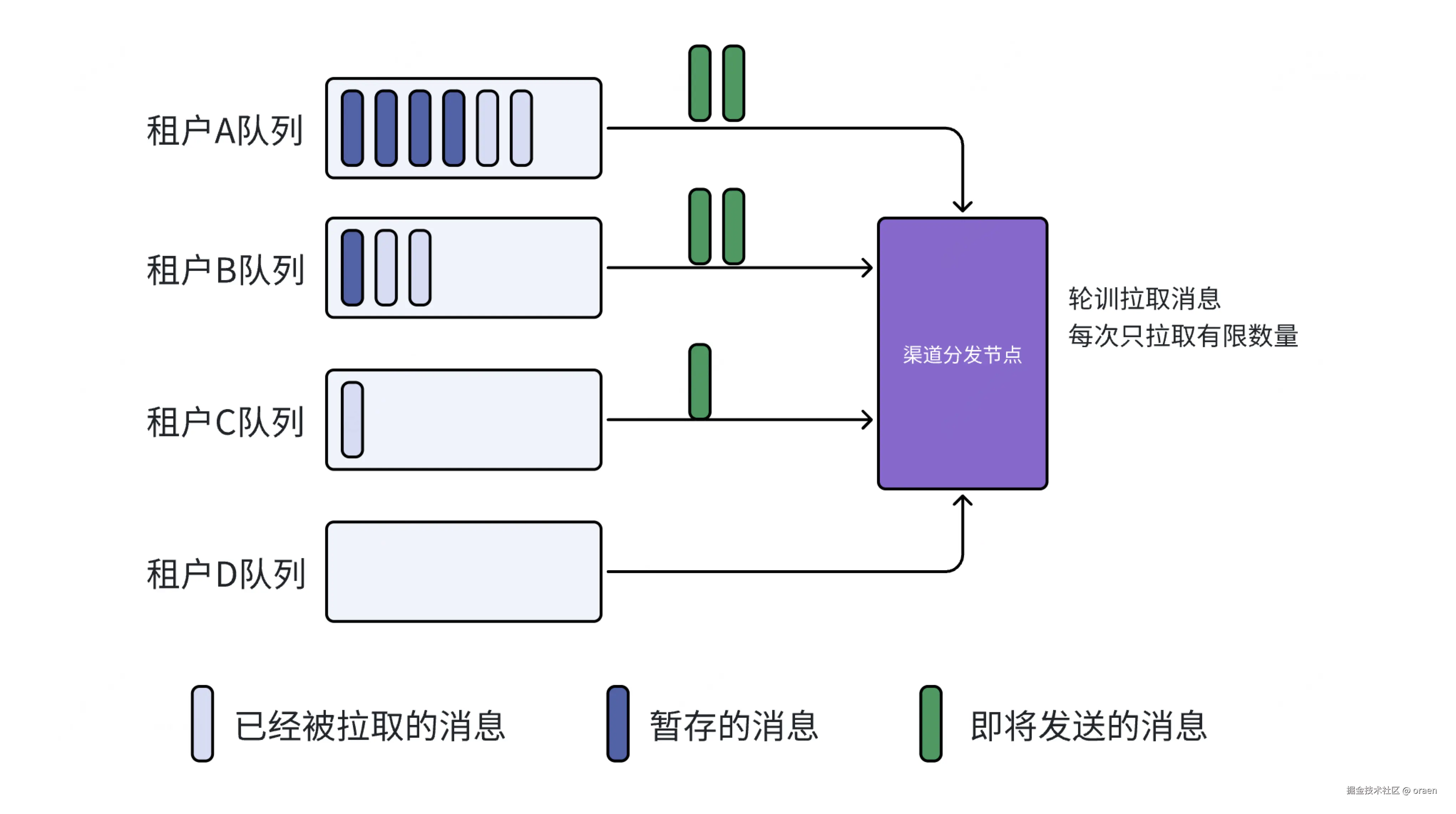如果只是按照不同的业务线/团队/租户,限制他们的发送速度,并且让他们的流量隔离互不影响,这其实是比较简单的,但是你如果想在高峰期限制他们流量的同时,又做到资源利用最大化,那么就有一定难度了。比如由于三方供应商能支持的最大qps是1000,现在有A,B,C三个团队,你为了防止把供应商服务打爆,分别给他们配置了300,300,400的qps,如果在C团队的空档期,只用了100的QPS,A和B又有很多消息需要发,这时候C那300qps部分的资源就一直空着,浪费了。这个时候我们能不能临时把C的qps分配给A和B呢,反正C目前也用不到。为了资源的利用,大家肯定都觉得这样是合理的,但是应该怎么把这部分流量分配给A和B呢,如果这个时候由于一些原因C需要的流量又多起来了呢。这时候应该怎么办。这些都是肯定需要考虑的问题。我们必须设计一套高效且合理的算法。