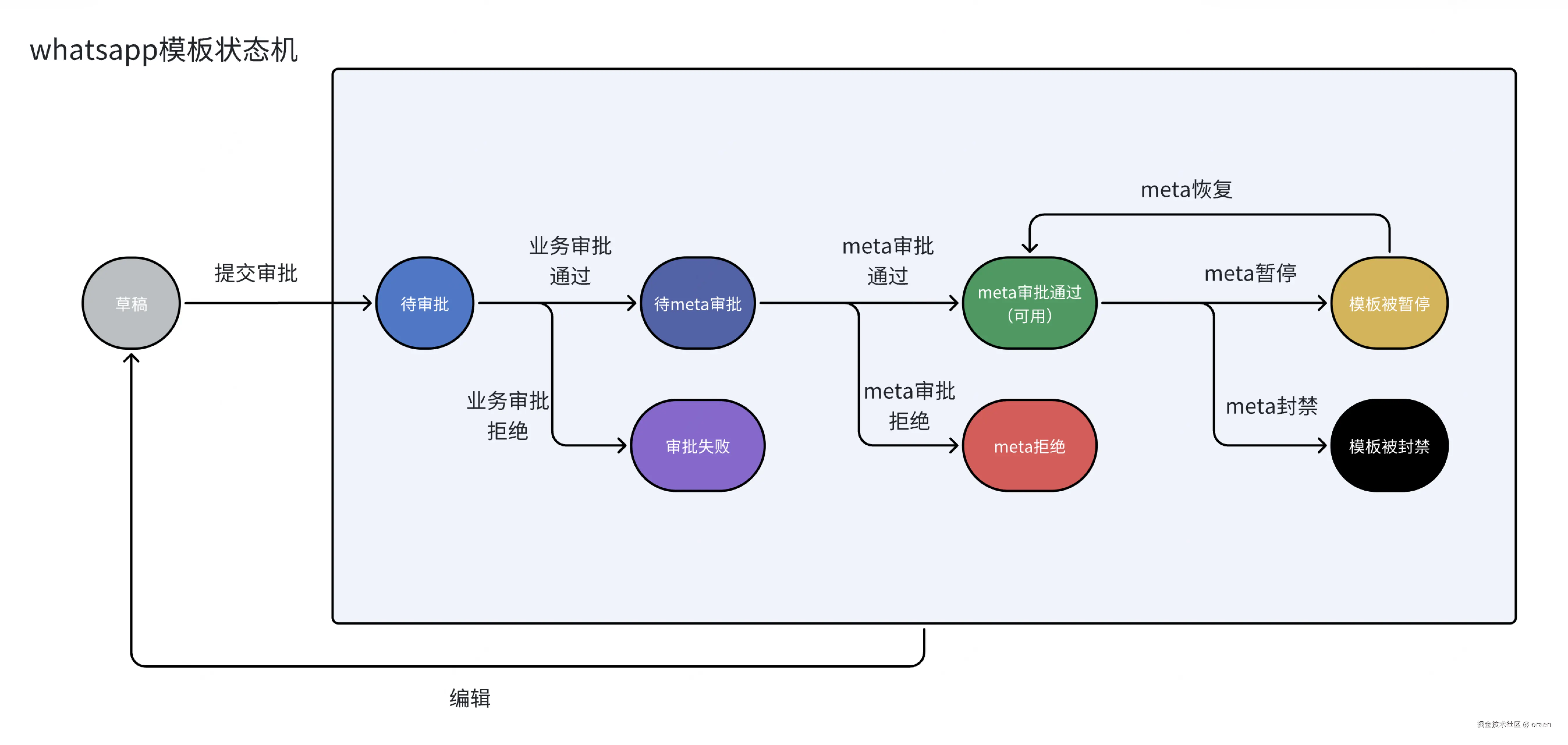 然后就是模板复用对于状态机扭转的影响,同样拿whatsapp的模板举例,尽管这些模板的内容一样,但是他们其实都是互相独立的模板,每个模板都能独立操作,都能独立进行编辑,编辑后可能就需要创建新的模板或者指向其他的复用模板,但是对于meta而言他们是同一个模板,用户修改和创建模板的时机和meta通过审批,拒绝审批,模板封禁,暂停,恢复事件来领的时间都是完全随机的,收到meta事件时我们需要把所有复用这个模板的模板的状态进行变更,加上meta事件延迟的情况,模板状态可能变得更加难以维护,这也是作者前面推荐把模板业务状态和渠道方状态设置为不同两个字段让他们尽可能隔离的原因,因为这尤其是在模板平台具有复用模板能力时能够大大降低模板状态机扭转的设计和维护难度。