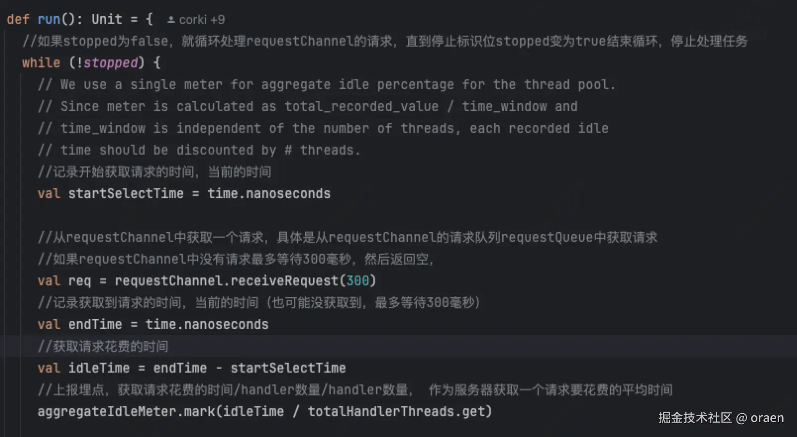 KafkaRequestHandlerPool中会使用KafkaRequestHandler创建并启动若干个(可以通过num.io.threads指定)新的线程,每个Handler都会抢占式地源源不断地在processor的RequestChannel成员requestChannel中获取请求处理,(各个processor用的是同一个requestChannel),