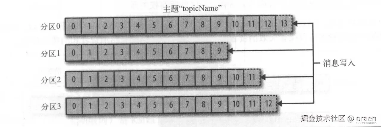 Kaflca 的消息通过主题进行分类。主题就好比数据库的表,或者文件系统里的文件夹。主题可以被分为若干个分区,一个分区就是一个提交日志。消息以追加的方式写入分区,然后以先入先出的顺序读取。要注意,由于一个主题一般包含几个分区,因此无法在整个主题范围内保证消息的顺序,但可以保证消息在单个分区内的顺序。下图所示的主题有4个分区,消息被追加写入到每个分区的尾部。 Kafka 通过分区来实现数据冗余和伸缩性。分区可以分布在不同的服务器上,也就是说, 一个主题可以横跨多个服务器,以此来提供比单个服务器更强大的性能。