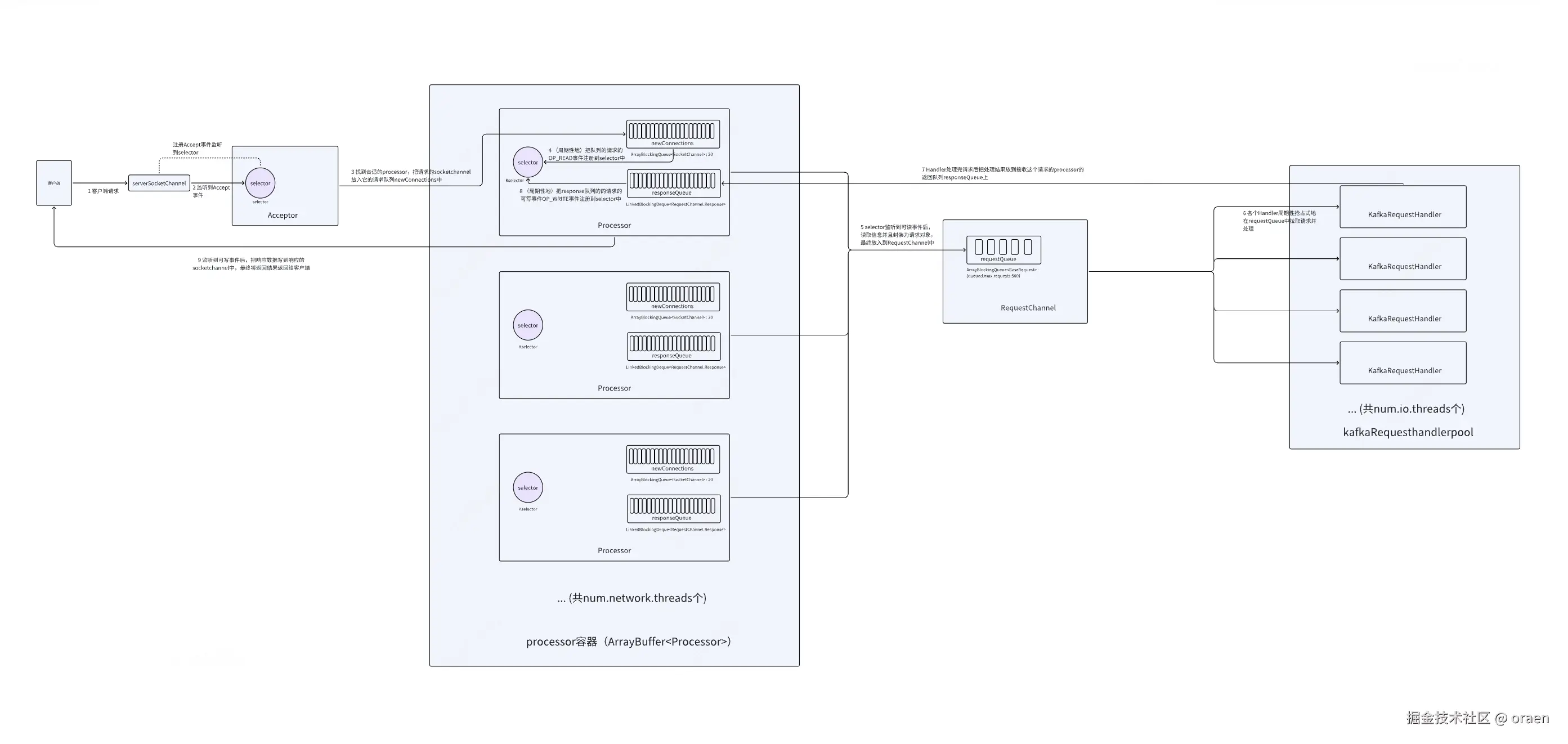 我们结合这个图,能够很容易知道如果一个请求从客户端到Kafka,处理后返回给客户端,这个消息是怎么流转的。