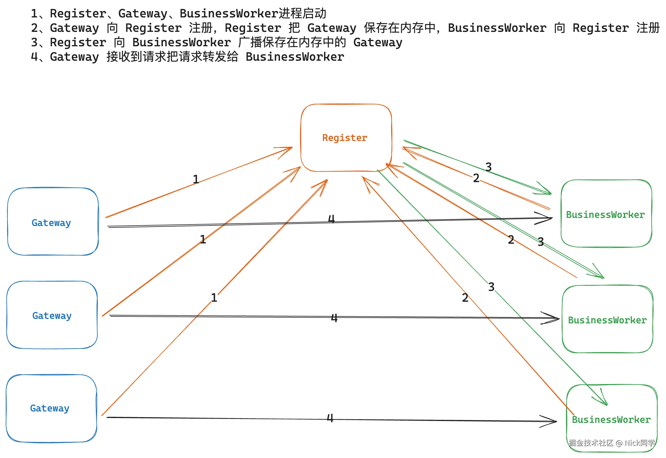 一个三个进程,Register、Gateway、BusinessWorker 3个进程是平级的,不是传统的 master worker 父子进程关系。