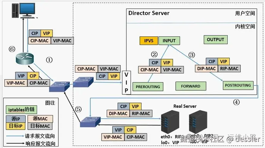 客户端请求发送:客户端发送请求到VIP(Virtual IP),这个VIP实际上是Director对外暴露的服务IP。
