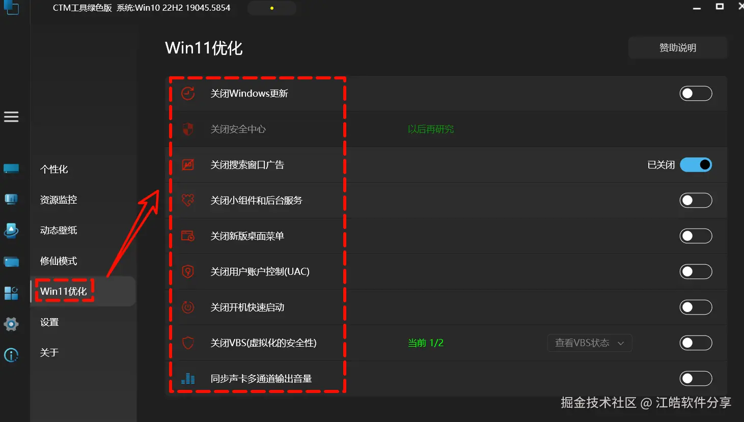 如果你使用的是 Windows 11 系统,还可以通过它实现多项系统级优化,如关闭自动更新、禁用系统广告、关闭用户账户控制等功能。