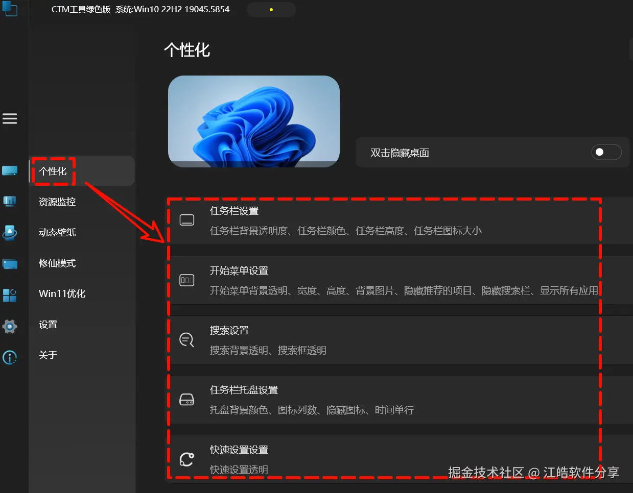 支持对任务栏、开始菜单、搜索框等界面进行个性化美化设置。