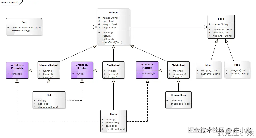 从上面六个原则的讲解中,应该体会到软件的设计是一个循序渐进,逐步优化的过程。经过一次次的逻辑分析,一层层的结构调整和优化,最终得出一个较为合理的设计图。整个动物世界的类图如下: