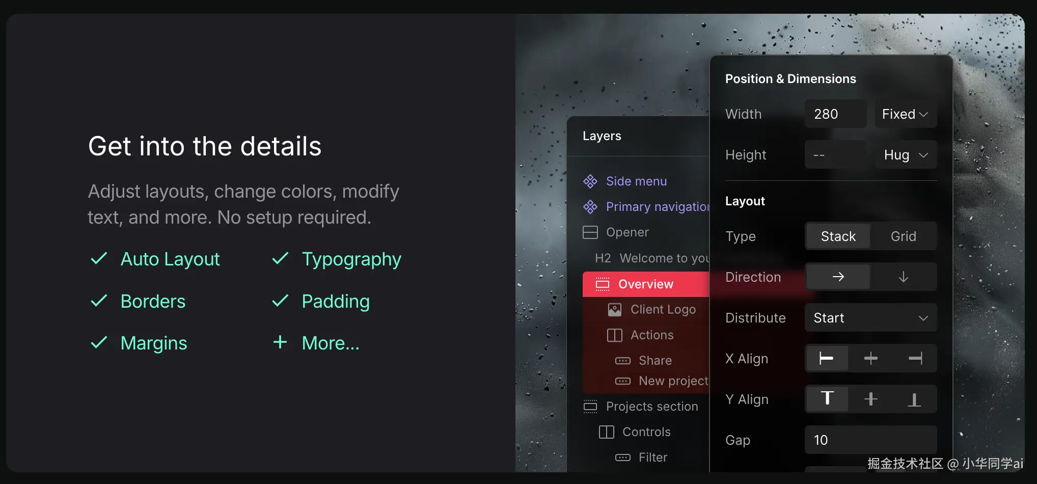 - 类 Figma 的 UI:拖拽、调整、编辑元素,直观操作,所见即所得。