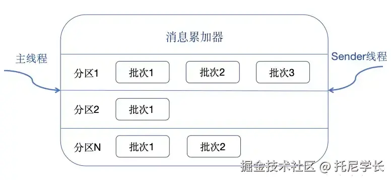 代码实现非常简单,但其底层的处理机制则复杂很多,核心是通过双线程(主线程、Sender线程)并行机制各自处理不同逻辑,并提升整体生产者吞吐量的。