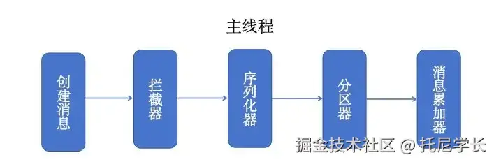 主线程负责消息创建,然后会依次经过拦截器、序列化器和分区器,并将消息缓存在消息累加器中。