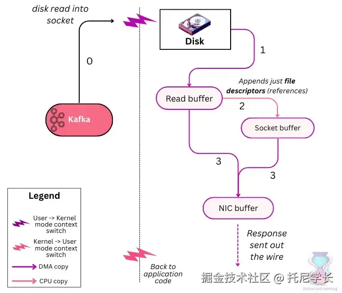 如上图所示,通过零拷贝机制,Kafka Broker磁盘上的数据读取到Read Buffer后,不再需要拷贝到APP Buffer中,而是直接拷贝到NIC Buffer中。