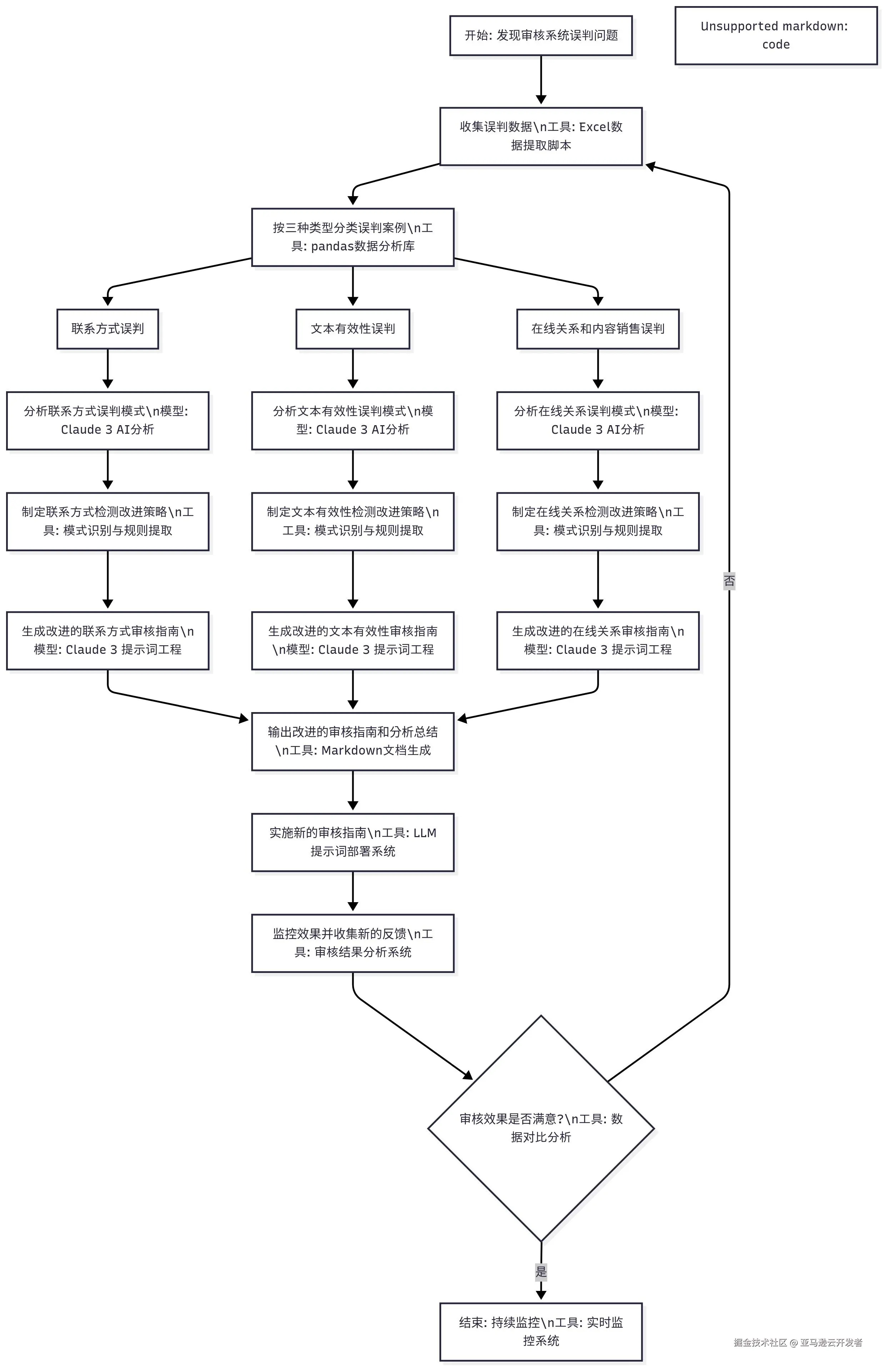 - 第一步分析文本审核结果,找出拒绝原因。再利用 Claude 模型探究每种误判类型的特性与模式,制定专属改进策略和规则,最后将策略转化为审核指南和提示词,生成分析报告,部署新提示词。