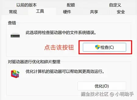 在【此电脑】中打开相机存储卡的读卡器,按下右键后点击【属性】;进入属性页面后再点击【工具】,进入后点击【检查】。