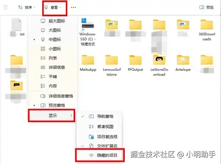 除了以上情况,在存储卡中找不到相片,还可能是相片被隐藏了。要想进行相机sd卡恢复数据,可以在电脑中打开存储卡,在上方选择【查看】,然后点击【显示】,最后按下【隐藏的项目】选项。