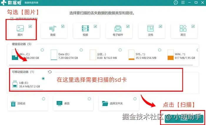 步骤1:在软件的扫描准备页面中,根据我们目前遇到的数据丢失问题选择文件的类别和需要扫描的SD卡,之后点击【扫描】;
