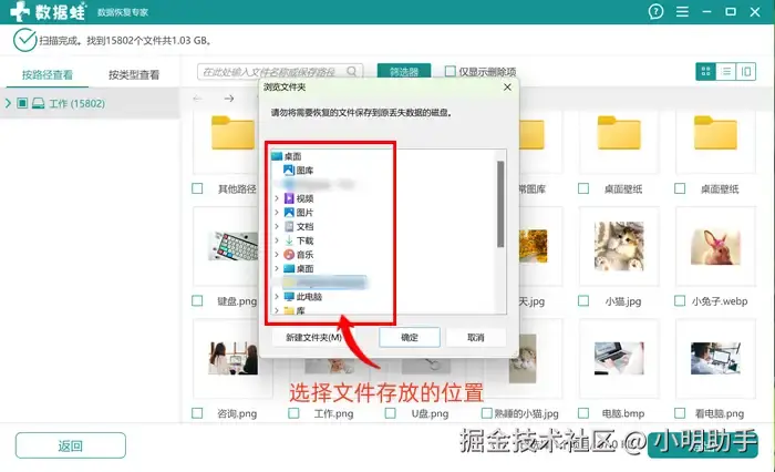 步骤3:点击完【导出】后,还需要在【浏览文件夹】的小窗中选好恢复文件另一个存放的位置。