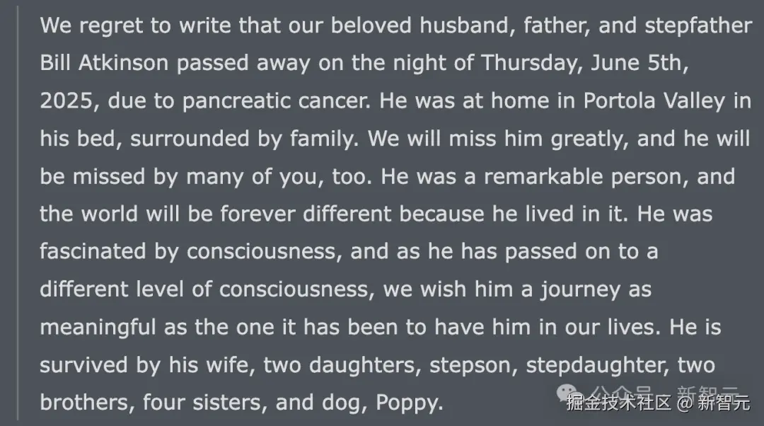 我们沉痛地告知各位,我们挚爱的丈夫、父亲和继父 Bill Atkinson 因胰腺癌于 2025 年 6 月 5 日(周四)晚在 Portola Valley 的家中安详离世,亲人陪伴在侧。我们将深深怀念他,相信你们中的许多人也会如此。他是个非凡的人,这个世界因他曾存在而永远不同。