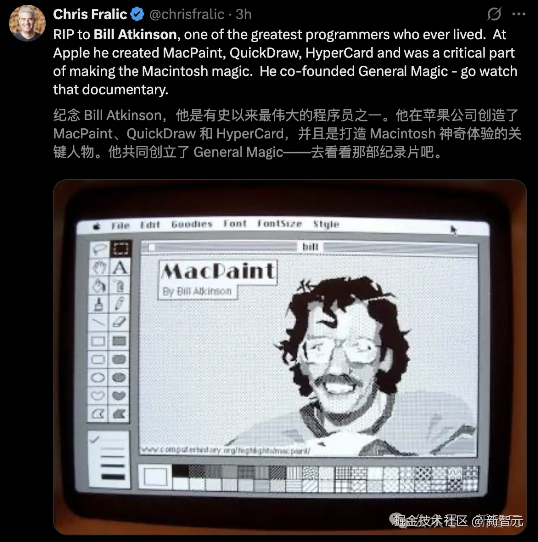 著名风投大佬 Chris Fralic 回忆称,「在苹果期间,他创造了 MacPaint、QuickDraw 和 HyperCard,是缔造 Macintosh 奇迹的关键人物。他还联合创办了 General Magic 公司」。