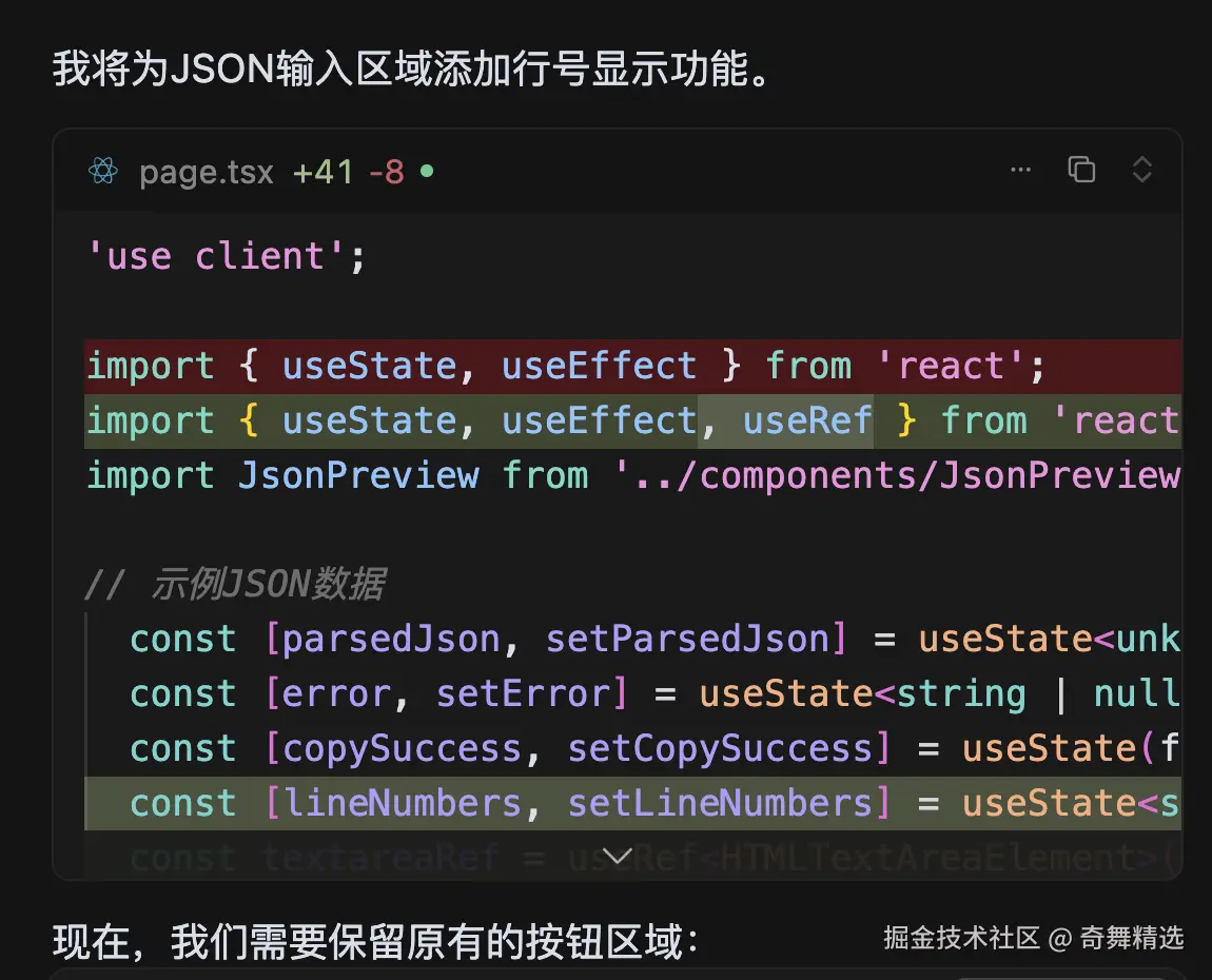 可以看到错误信息也显示出来了,但是还没有行号导致错误不是特别明显,因此在输入框还需要增加行号显示,继续 Vibe Coding。