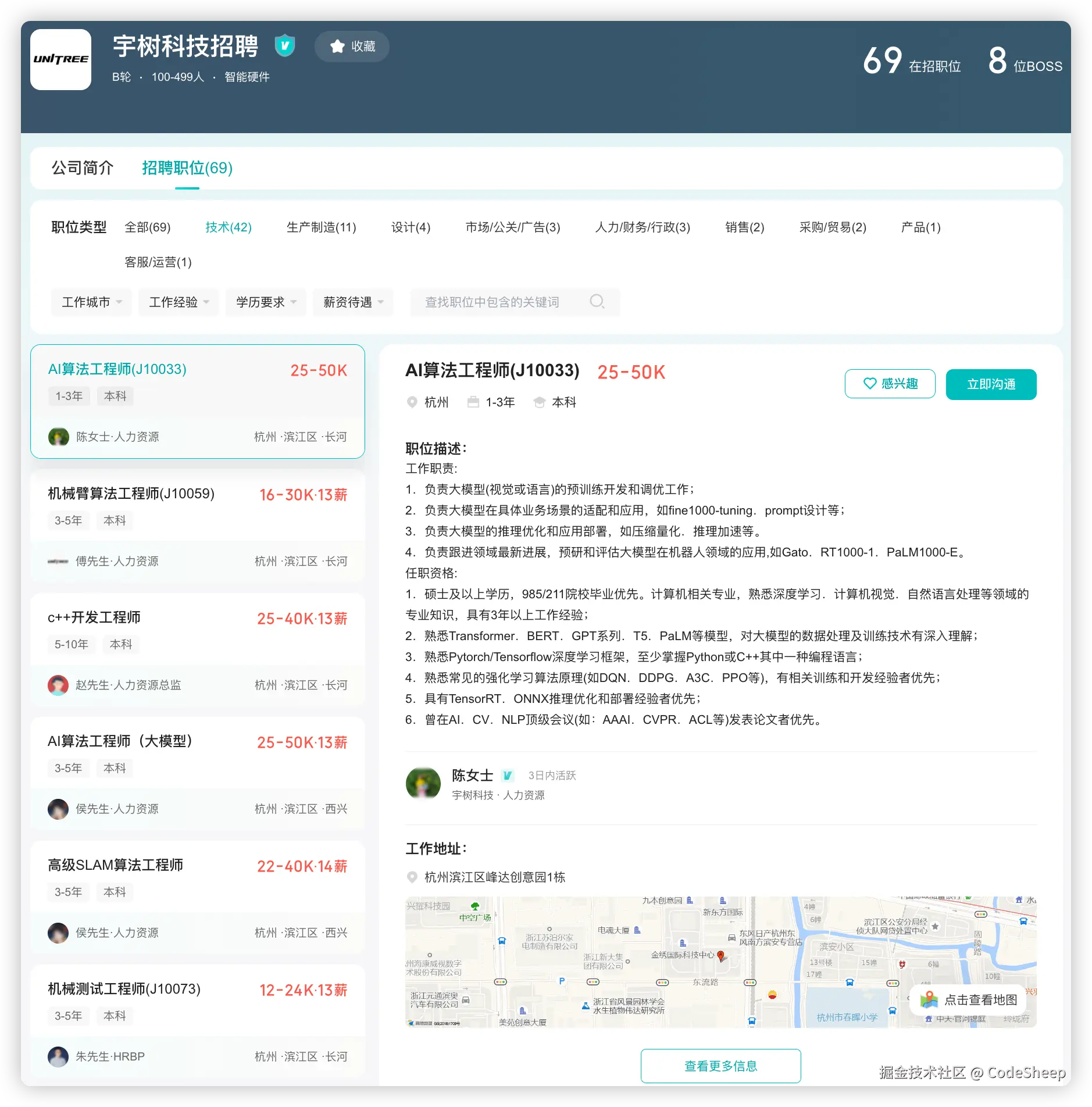 正好最近也看到宇树在某招聘平台上又更新了一波热招职位和招聘信息,工作地点主要 base 在杭州。