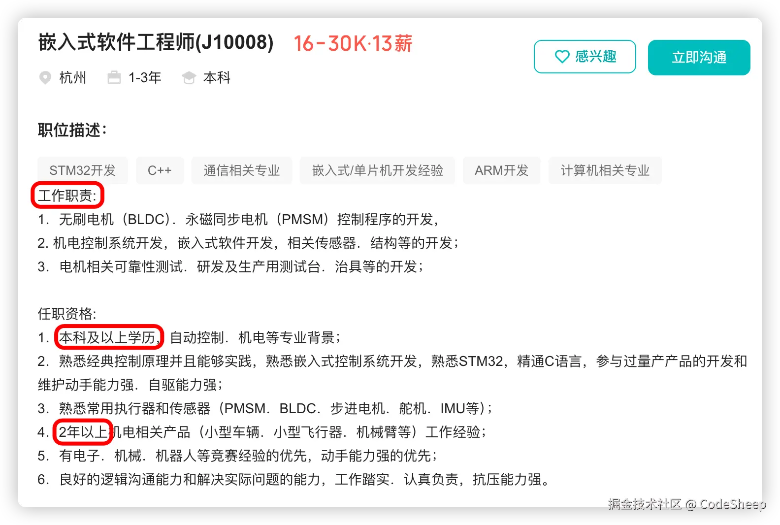 而类似于「嵌入式软件工程师」等这类开发岗位,其所要求的编码经验和工程能力基本都是和机电控制、传感器开发等相关,不过学历和工作经验要求相比核心算法岗也会稍微宽松一些,大家也可以感受一下。
