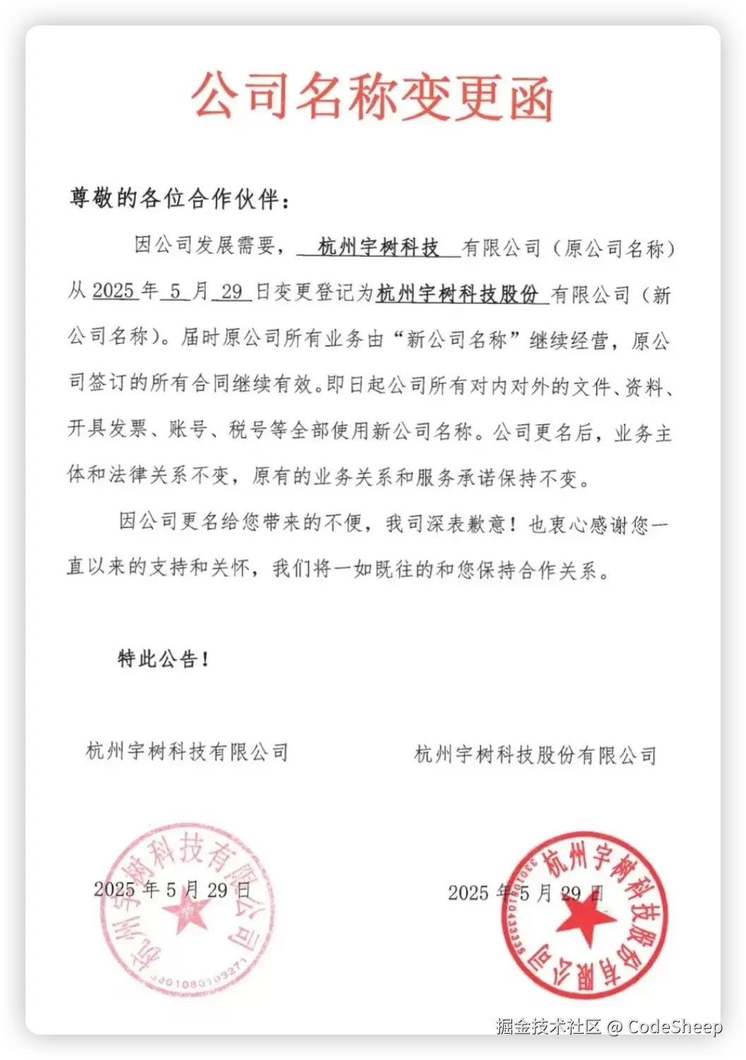 宇树向其合作伙伴发布了一封公司名称变更函称,因公司发展需要,公司名称从 “杭州宇树科技有限公司” 变更为 “杭州宇树科技股份有限公司”。