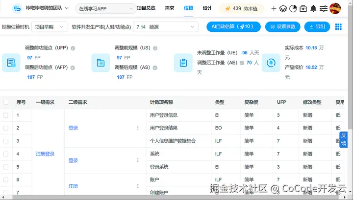 另外,为了提高项目估算的科学性和准确性,可以考虑使用AI估算工具。如Co-Project智能项目管理平台的AI自动估算功能或软件成本造价工具,通过多角度、多层级地调整影响因子(包括设置调整因子如软件估算时机、软件因素、开发因素,以及调整功能点值如复杂度、修改类型、复用程度等),实现了一键自动估算项目规模、生成产品报价的功能,从而提高了项目估算的科学性和准确性,使用这些功能能够节省15%-25%的开发成本。