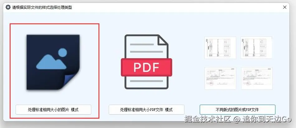 选择设定图片模式:处理标准相同大小的图片文件,软件可以处理图片支持格式包括(jpg、png、bmp、tif等多种图片和照片格式),可以处理PDF文件,可以定制改源码后处理非标的文件。