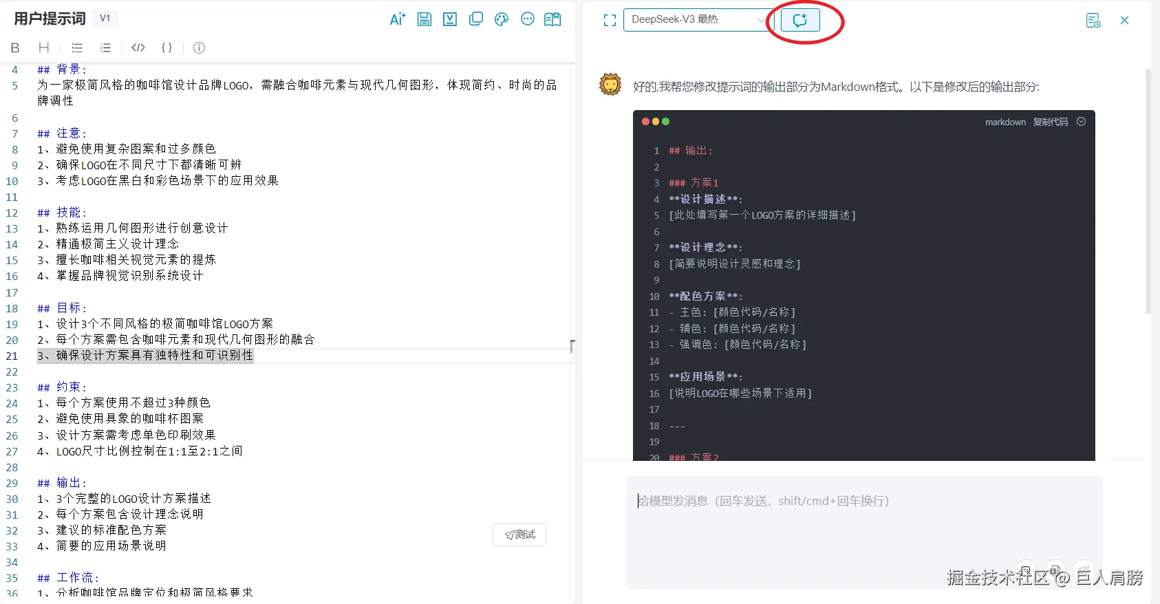 如果对生成的结果不满意可以调整左侧的提示词,且点击新会话按钮可以对左侧提示词进行提问,让AI 帮你改提示词。如:我们需要把输出部分改为用markdown输出。
