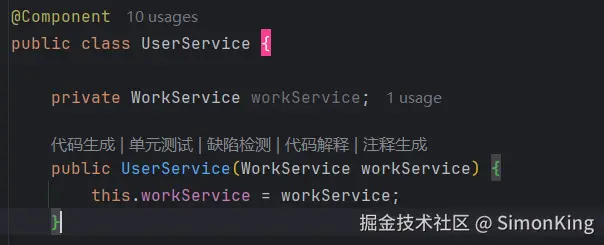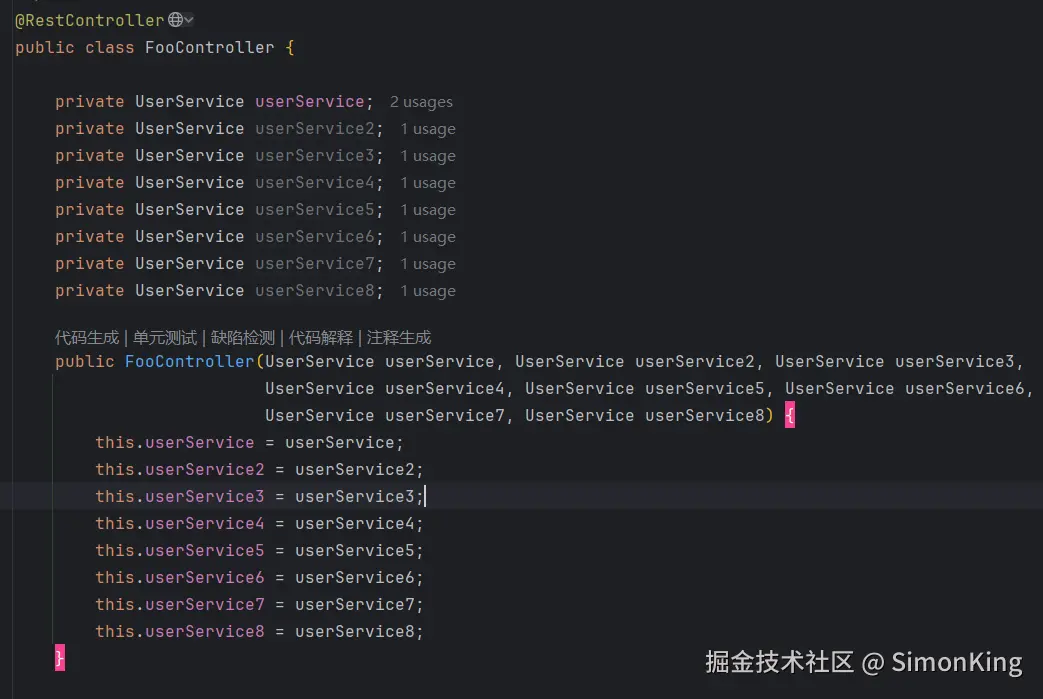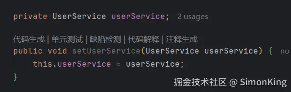 如代码所示,UserService是通过当前类FooController的构造函数,将UserService对象注入到当前类中。注入之后,方法foo2()就可以使用UserService直接调用方法。