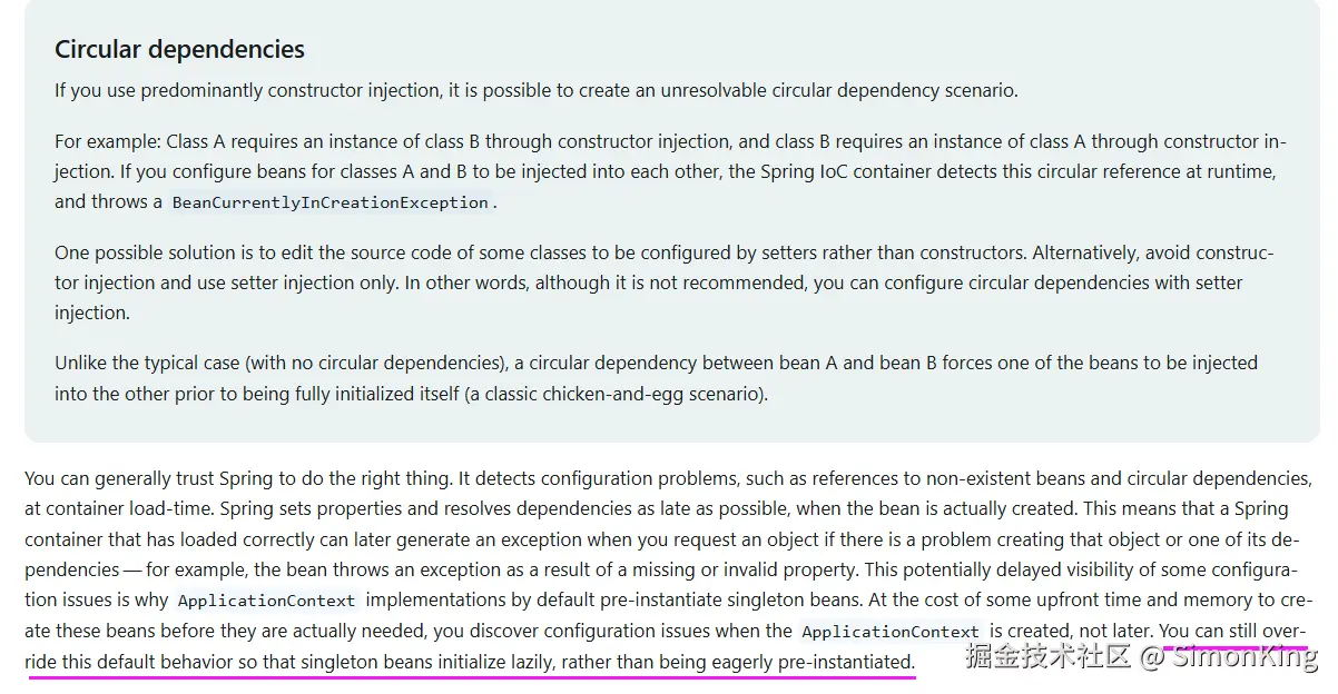 Spring兼容了大部分场景,Spring 会尽可能延迟设置属性和解决依赖关系,直到 bean 实际被创建时才进行。如果有问题,可以覆盖这种默认行为,使单例 bean 延迟初始化。