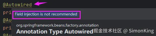 在开发过程中,肯定会使用依赖注入。大多数情况下会通过@Autowired注解作用在字段上,从而将Bean注入进来。但是Spring官网并没有推荐使用这种方式。包括我们常用的开发工具Idea,也会有警告提示: