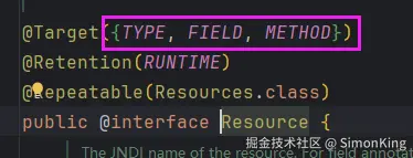 Spring 也支持通过在字段或 bean 属性的设置方法上使用 JSR - 250 的 @Resource 注解(jakarta.annotation.Resource)来进行依赖注入。@Resource注解带有一个 name 属性。默认情况下,Spring 将该属性值解释为要注入的 bean 的名称。只能作用在被修饰的注解作用在类、接口和枚举上,方法以及字段上。