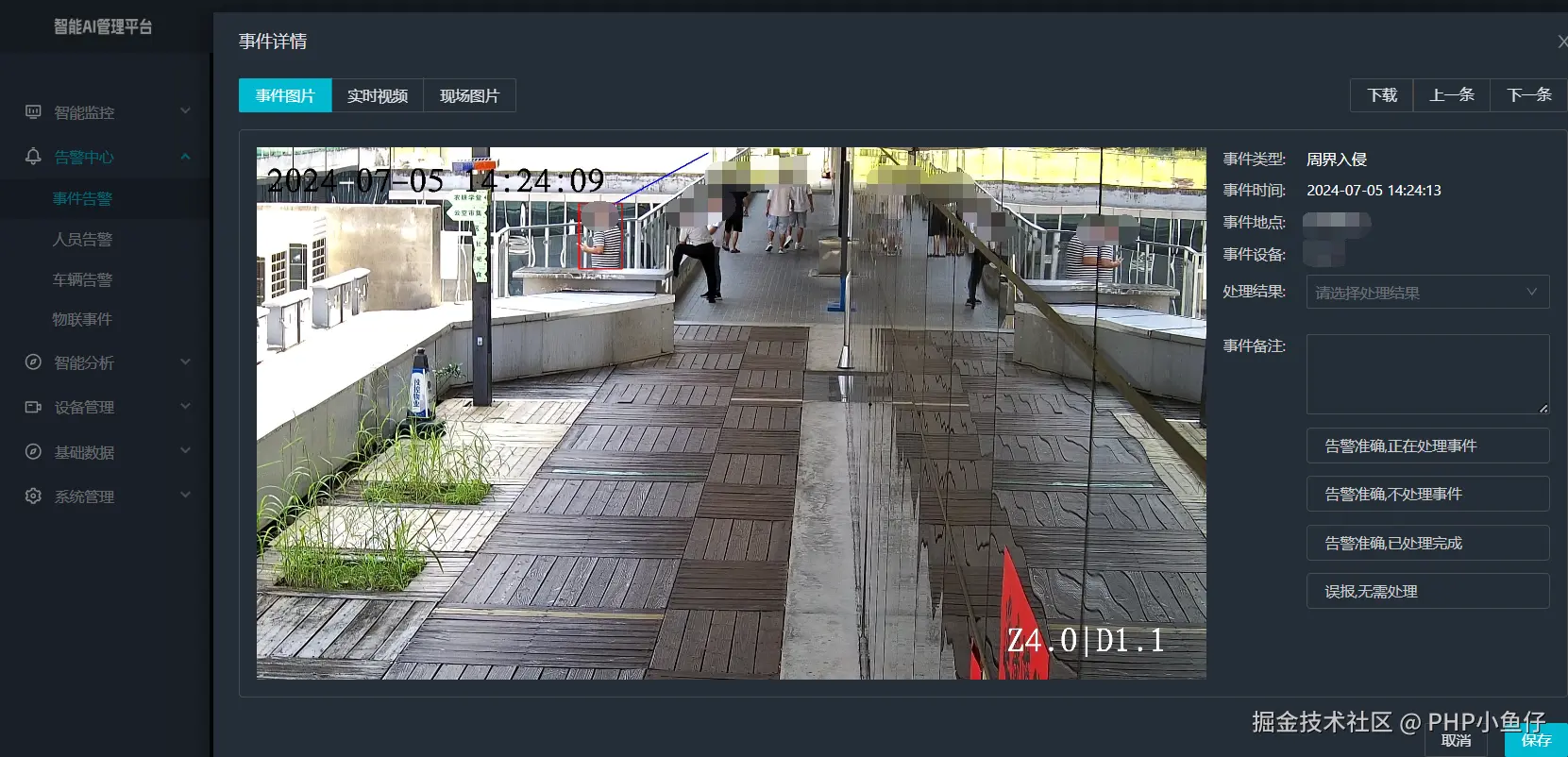 2)告警中心:告警中心将展示所有算法检测出的告警事件,用户可对告警信息进行处理、下载告警图片等。
