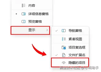 在【此电脑】找到丢失文件的位置,点击进入后在上方点击【查看】,进入后拉下去指向【显示】,在新的列表就能看见【隐藏的项目】了。