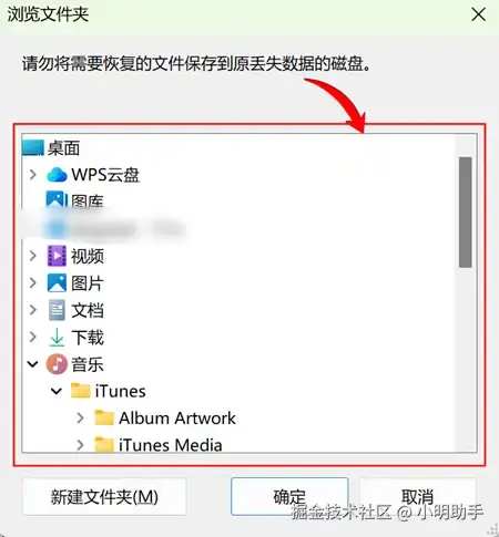步骤3: 点完【导出】后,在【浏览文件夹】的弹窗中选择恢复文件的位置。