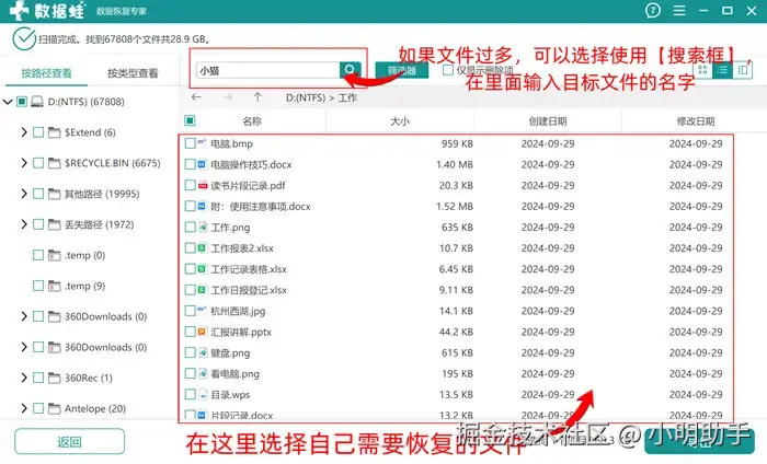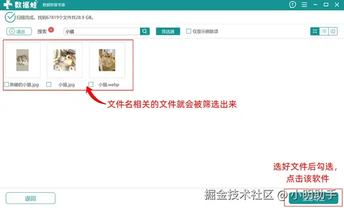 步骤2: 在扫描工作完成后,可以在软件的指定位置上选择自己需要恢复的文件,如果文件太多,选择使用【搜索框】能够大大提高效率;找到文件后,点击【导出】;