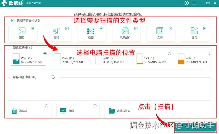 步骤1: 拥有数据 蛙恢复专家后,开启该软件,在首页上方选择文件类型,中下方选择扫描的电脑位置,最后点击【扫描】;