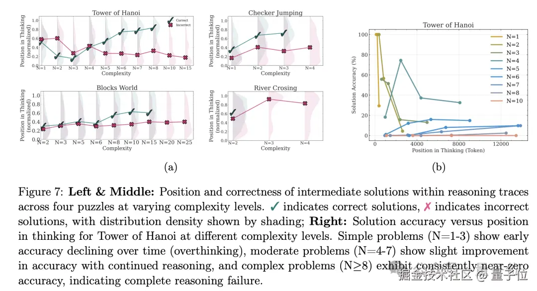 然而,实验结果显示,模型的失败点几乎没有改变,它们仍然无法突破任务复杂性限制,性能没有提升,且观察到的崩溃仍发生在大致相同的临界点。