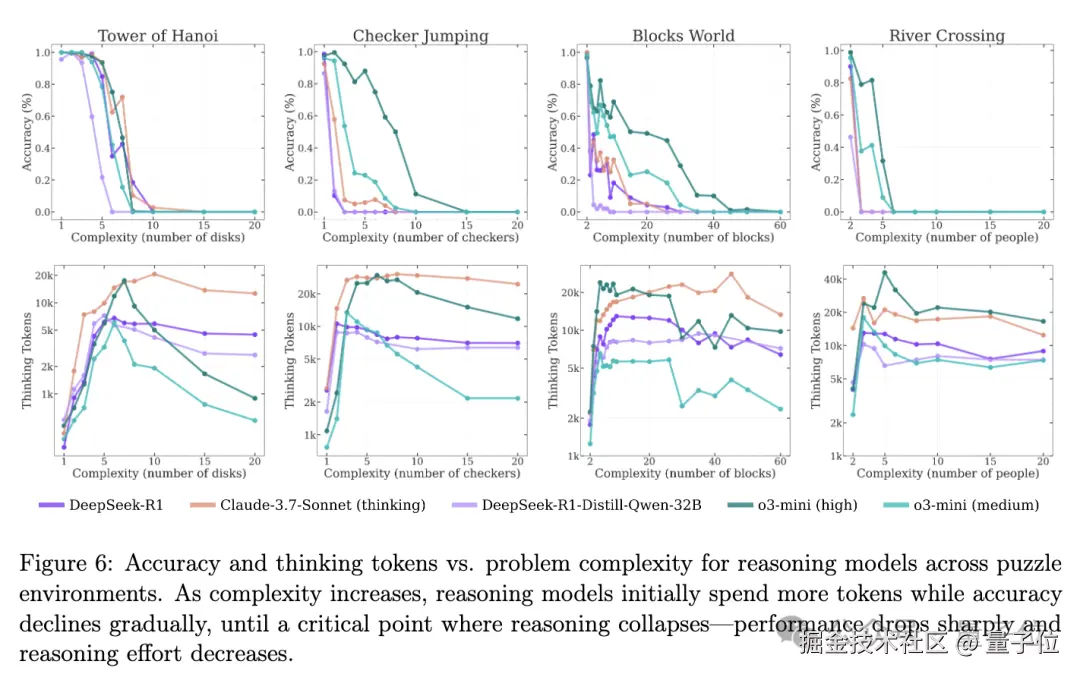 所有模型在任务复杂度提升后呈现出相似的模式:随着问题复杂度的增加,准确率逐渐下降,直到超过特定于模型的复杂度阈值后完全崩溃,准确率为零。