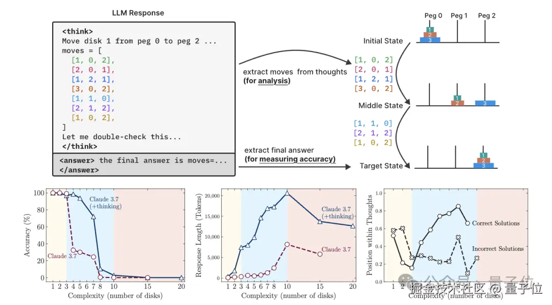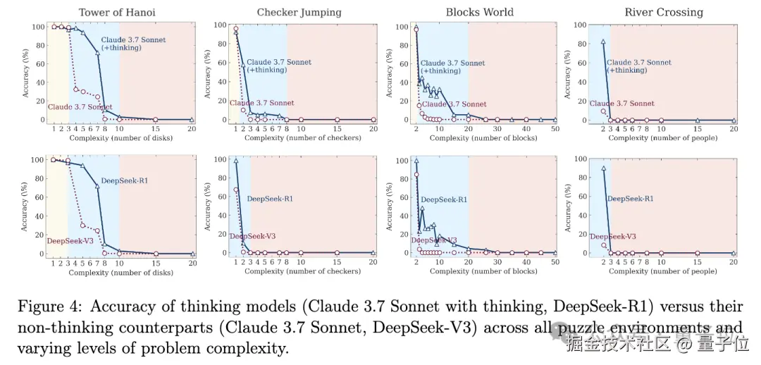 然而,当问题复杂度继续增加并超过某个临界点时,无论是推理模型还是标准模型都会经历完全的性能崩溃,准确率直线下降至零。