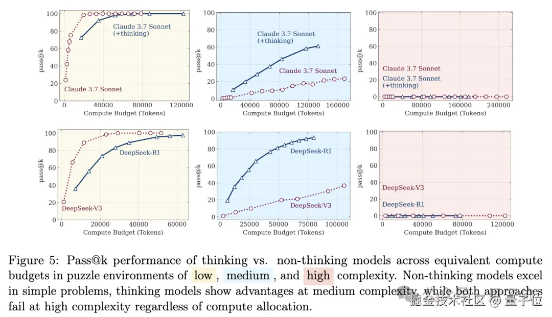 以下是在低、中、高复杂度的谜题环境中,思考模型与非思考模型在同等计算预算下的 pass@k 性能表现: