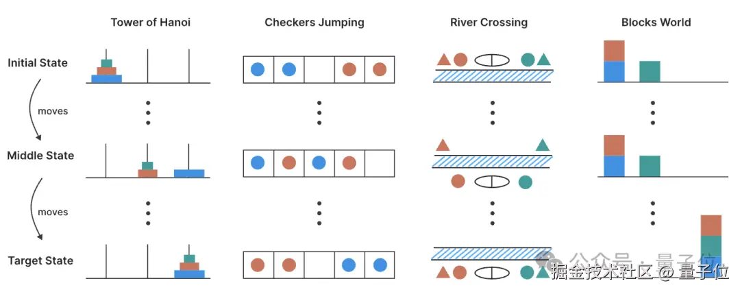 巧妙之处在于,四类谜题的难度可以精确控制,同时保持逻辑结构的一致性,研究者能够系统观察模型在不同复杂度下的行为变化,比如生成的每一步移动是否正确、是否重复试错。