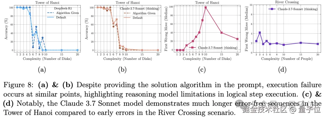 团队认为这一点非常值得注意,因为寻找和设计解决方案本应比单纯执行给定算法需要更多的计算。这进一步凸显了推理模型在验证和遵循逻辑步骤解决问题方面的局限性,表明需要进一步研究以理解此类模型的符号操作能力。