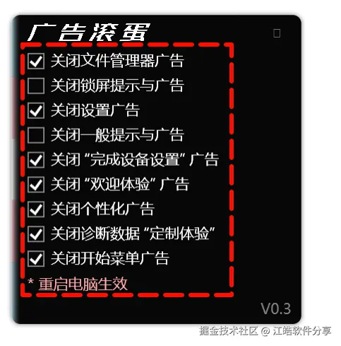 软件功能聚焦于禁用系统中不必要的广告推送模块,涵盖文件管理器提示、锁屏通知、设置界面广告等多个常见干扰项,配置简单,重启后立即生效。